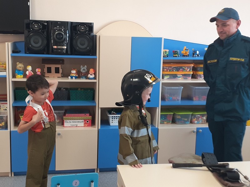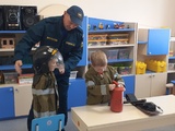 Дети с большим интересом пробовали пользоваться огнетушителем, примерять каску, надевать костюм пожарного.