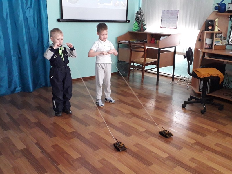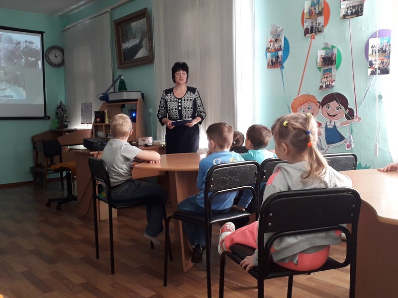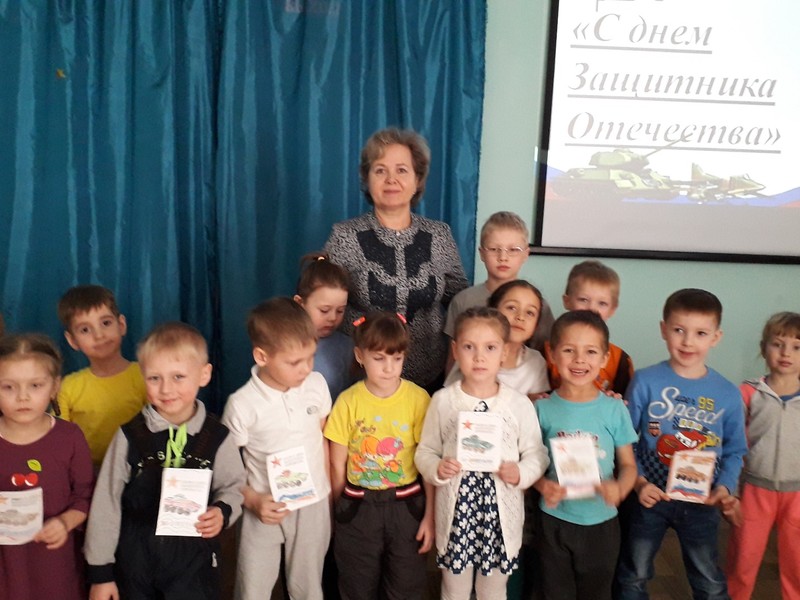 Специалист библиотечной системы Любовь Владимировна, используя видеопрезентацию, закрепила и расширила знания детей об истории возникновения Армии, как она называлась в разные периоды существования и как изменялись ее оснащение и вооружение. Дети называли рода войск, отгадывали загадки, выкладывали звезду из деревянных палочек, состязались в быстроте и ловкости, спели задорную армейскую песню.