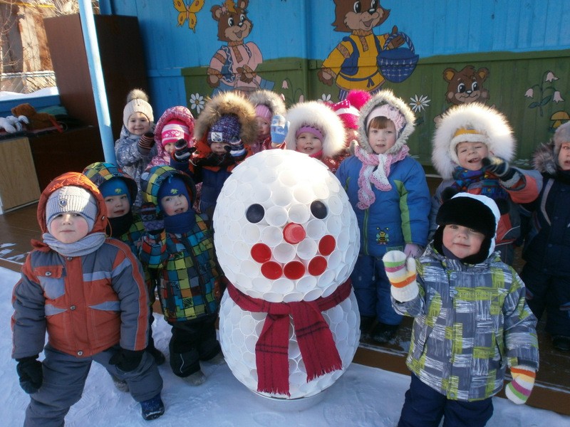 Реализация проекта «Зимняя сказка» помогла выявить родителей с творческими способностями. Поделки родителей из бросового материала - снеговик, шары украсили веранду и беседку на участке.
