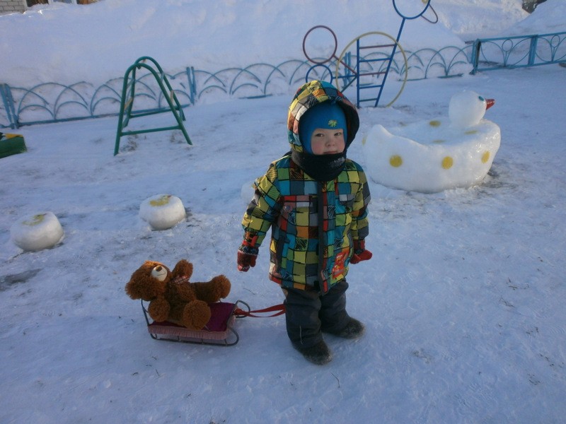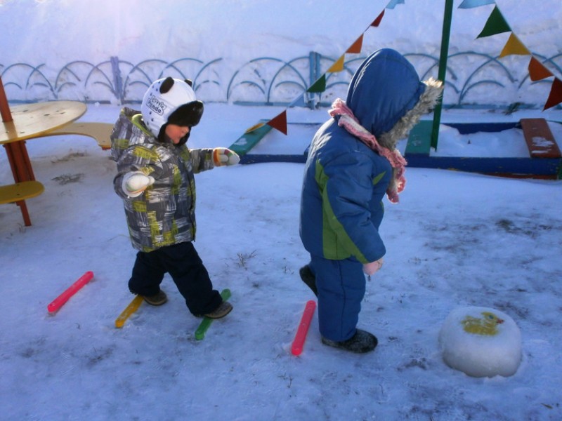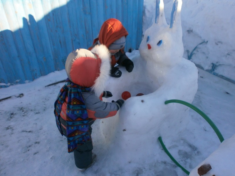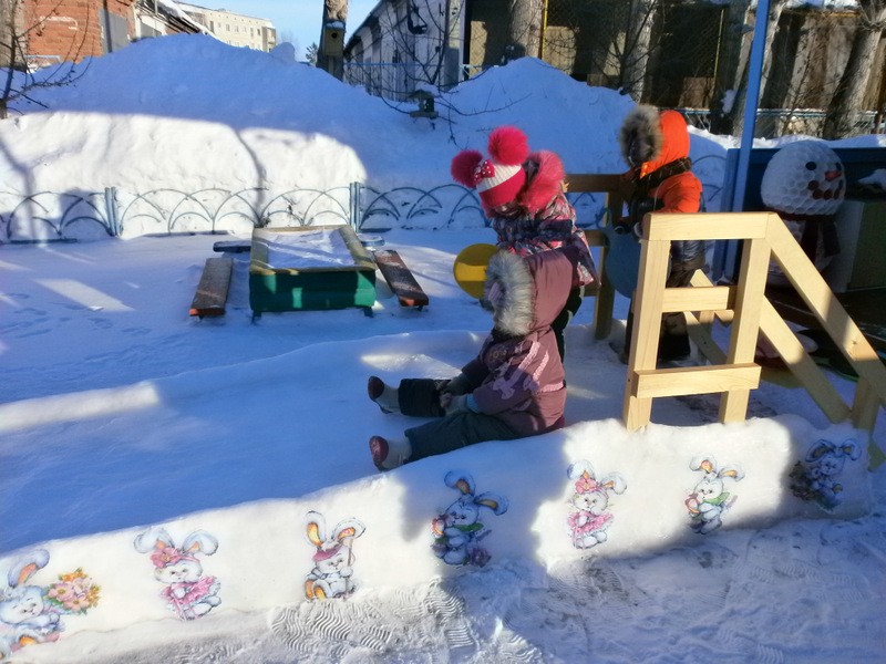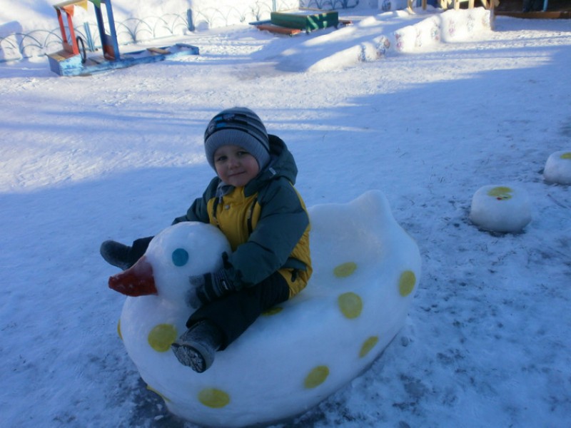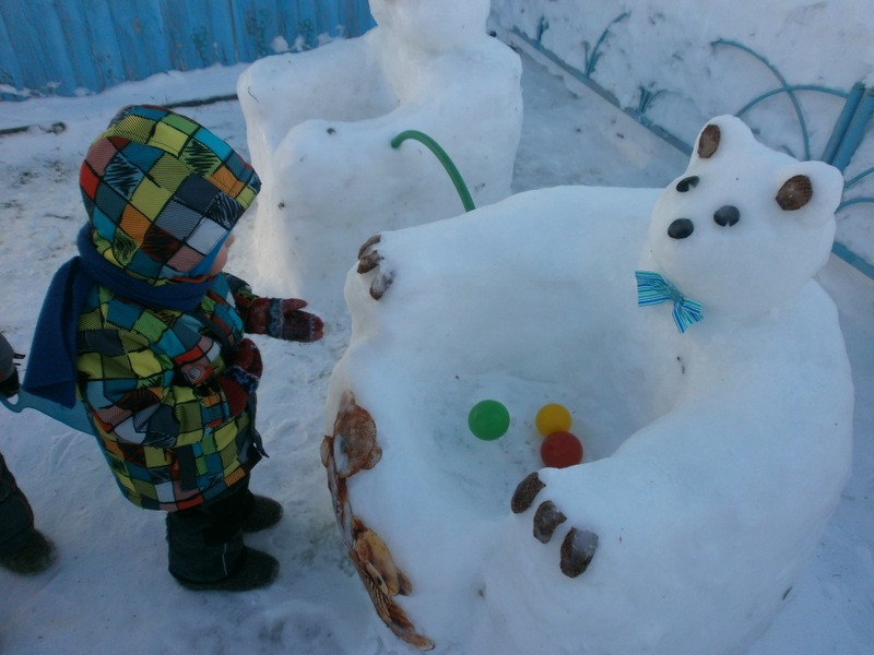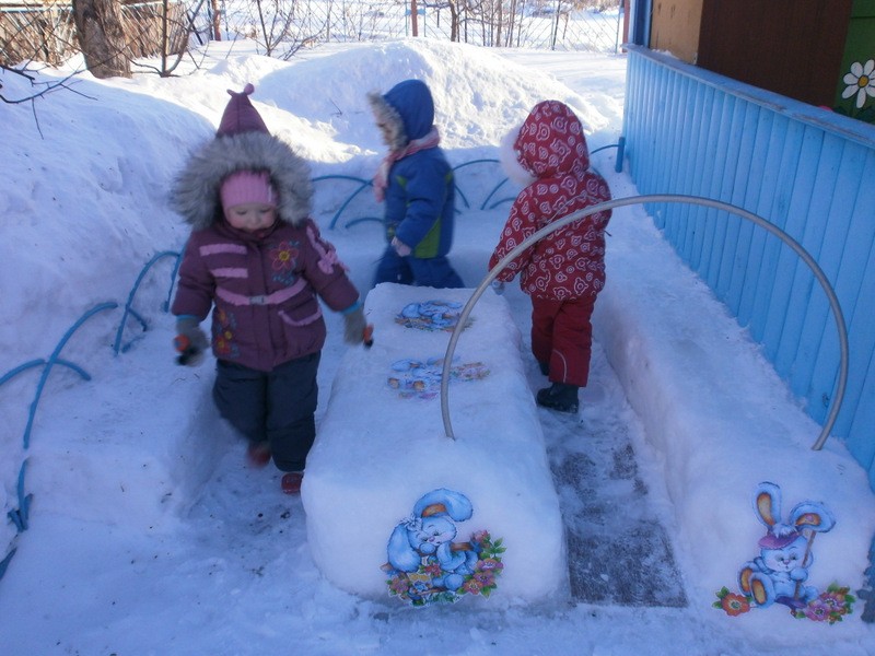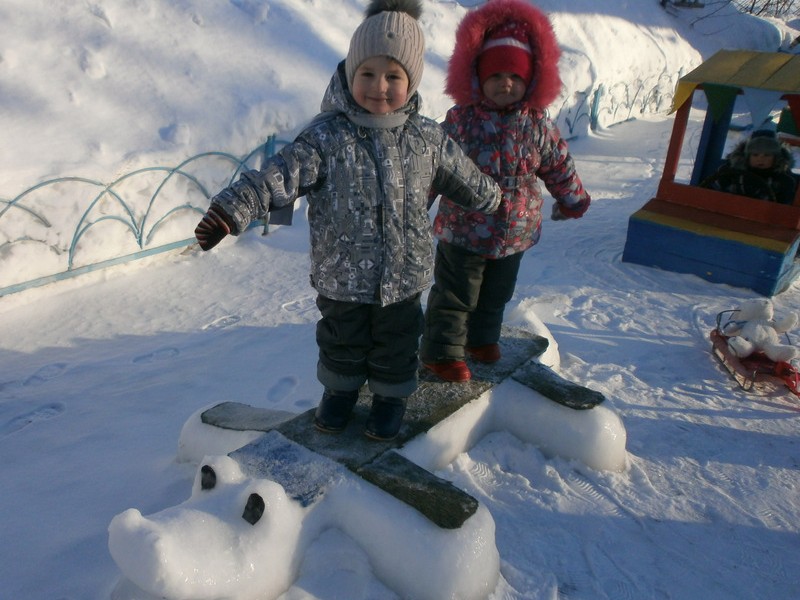 Воспитателем группы «Крохи», совместно с родителями, созданы благоприятные условия для воспитательно-образовательной работы с детьми на прогулке в зимнее время. На участке появились снежные постройки - крокодил, заяц, медведь, уточки, лабиринт, что позволило активизировать двигательную активность детей. Большую радость доставила детям горка для катания.